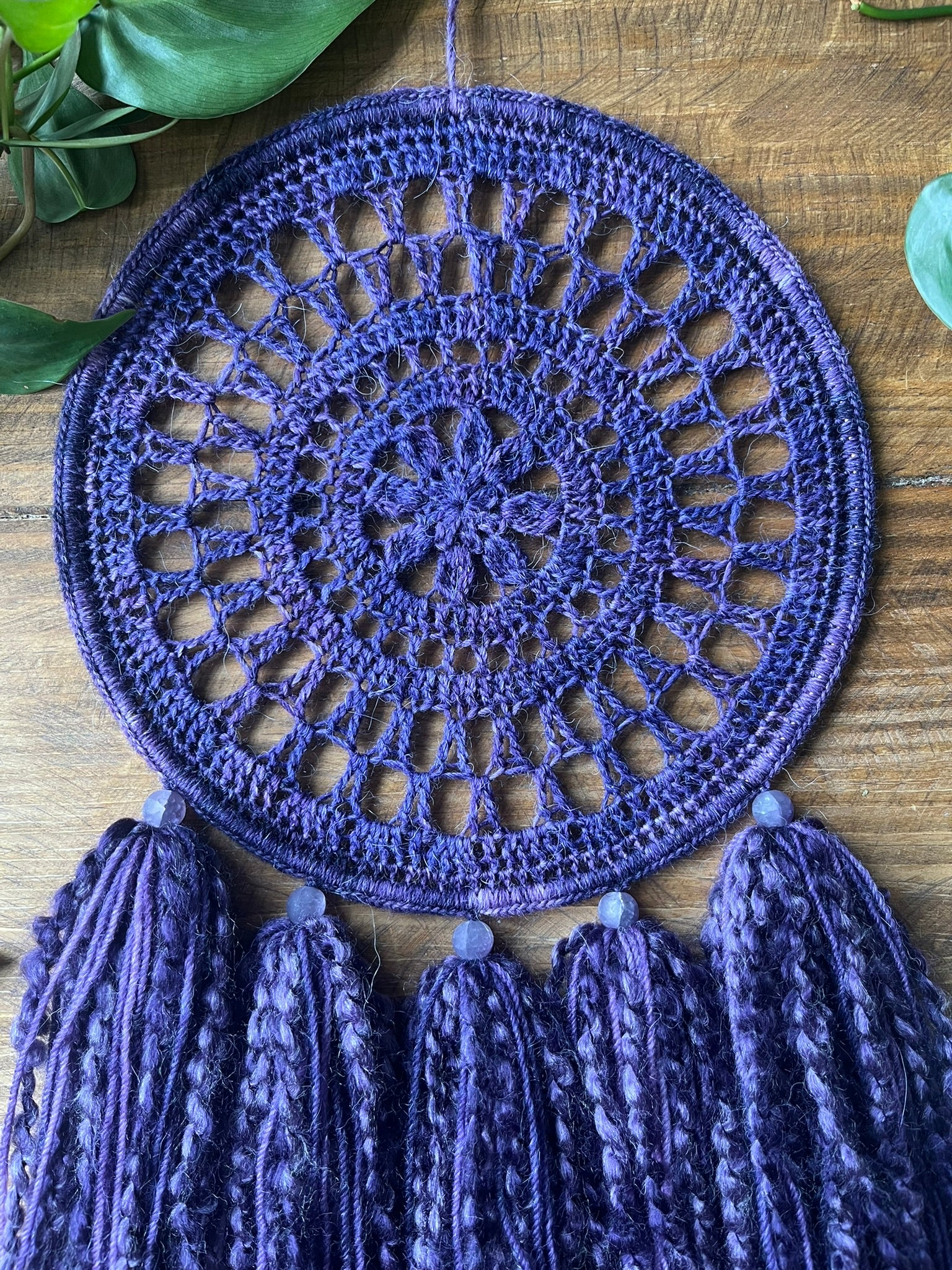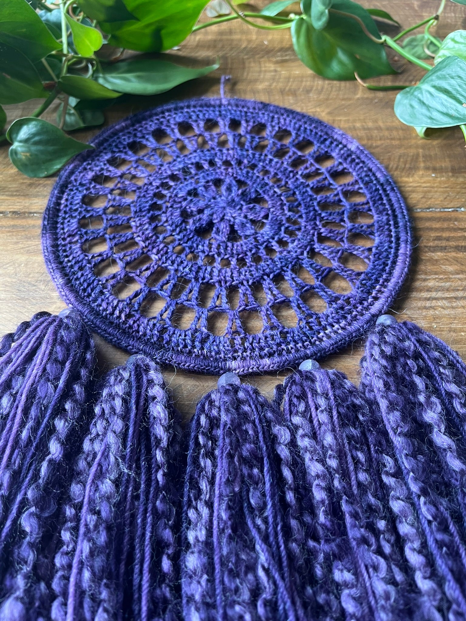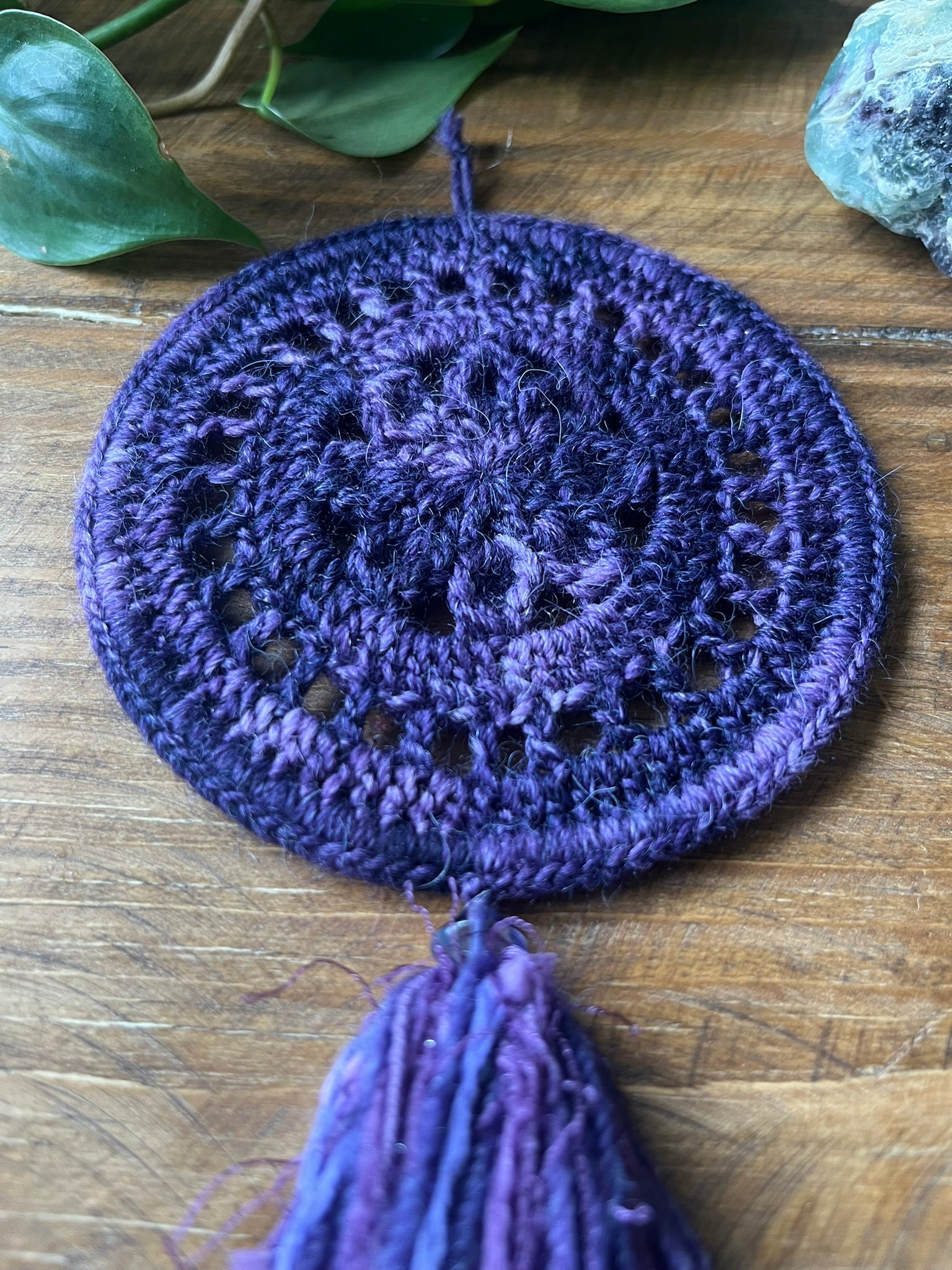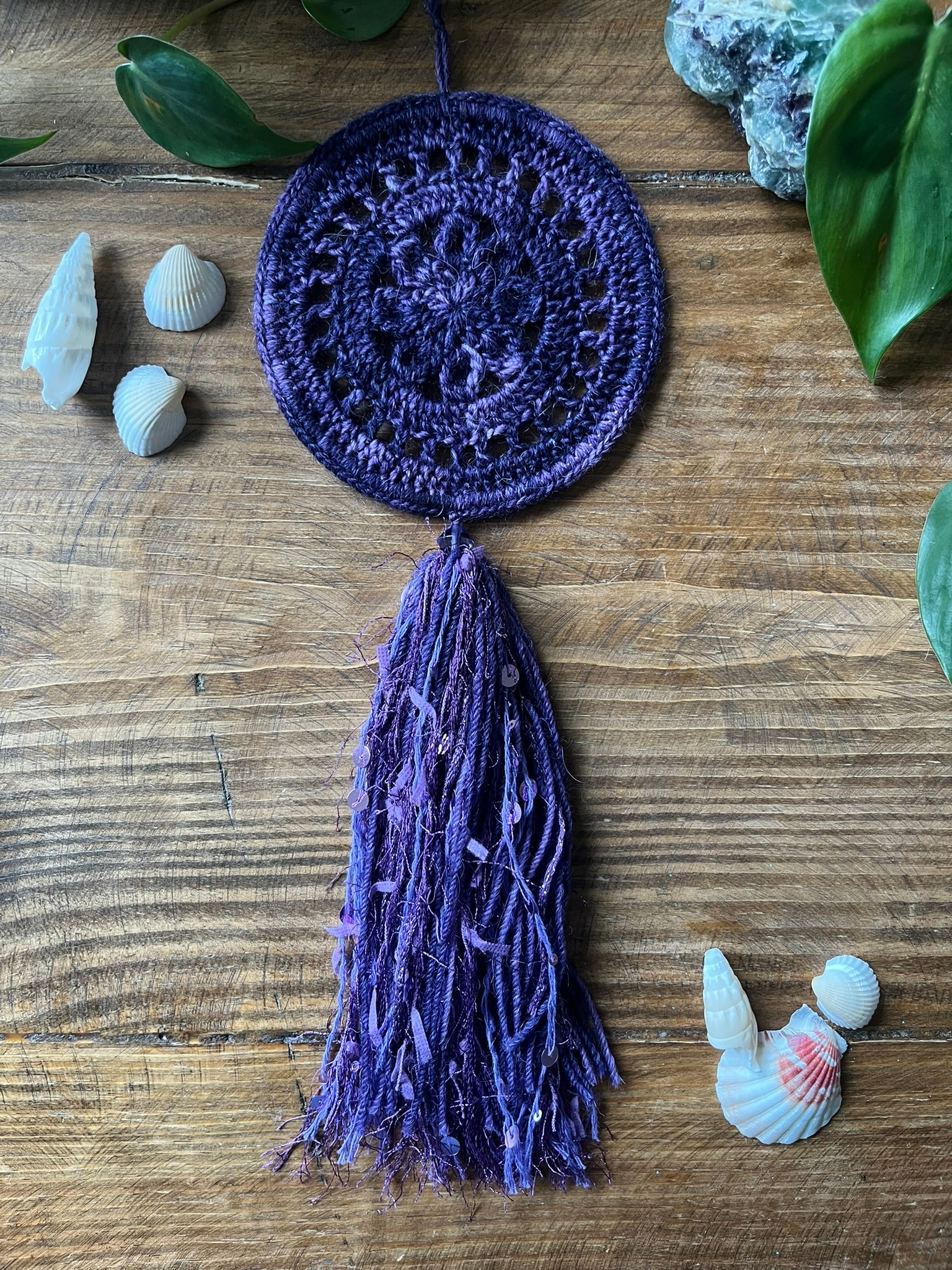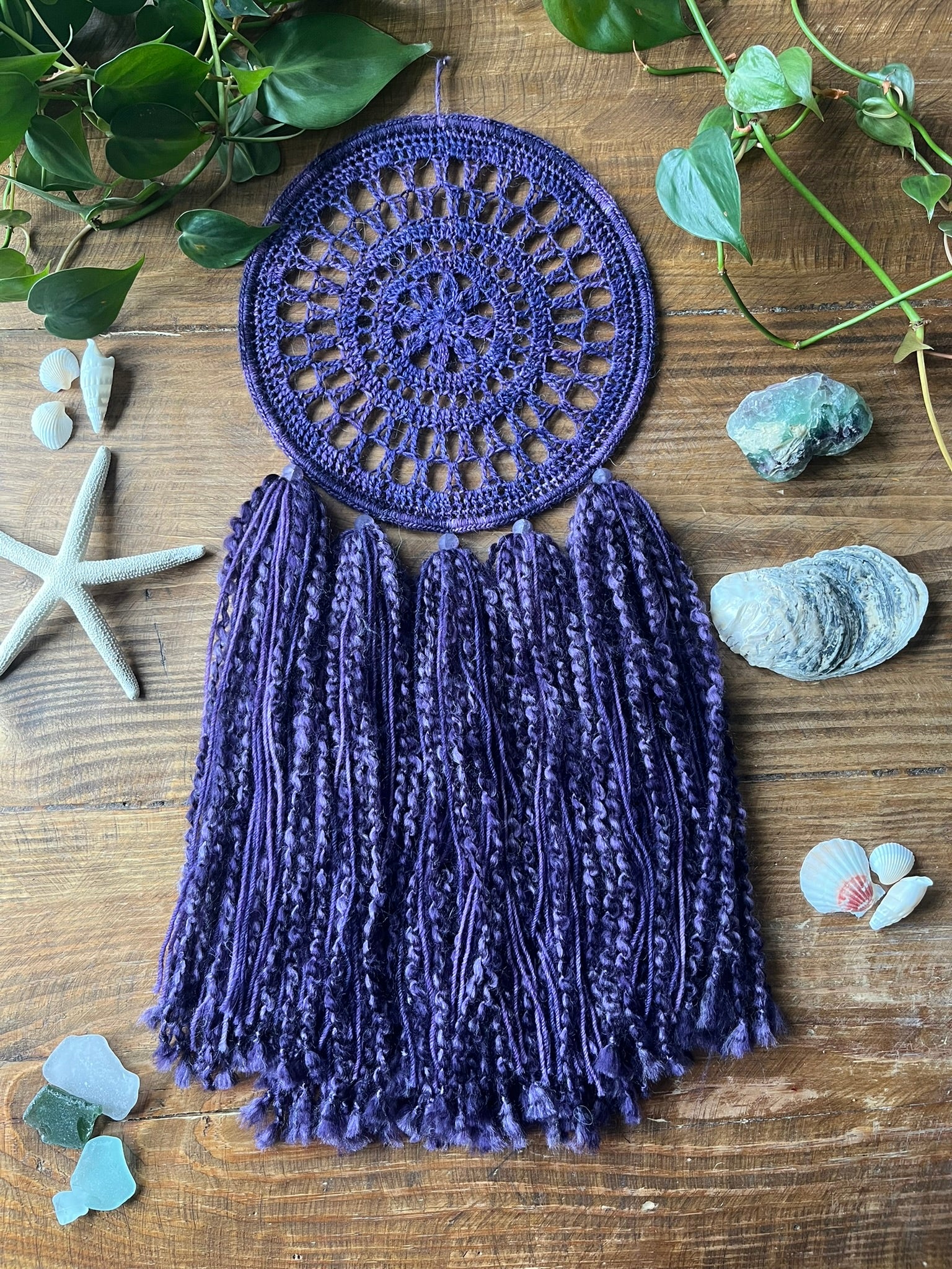 Dive into a world of ocean hues and shimmering magic with these hand-crocheted dreamcatchers. Inspired by the sea, each piece blends hand-dyed alpaca yarn in blues, aquas, purples, and iridescent accents to capture the enchanting beauty of waves, tides, and coastal treasures.