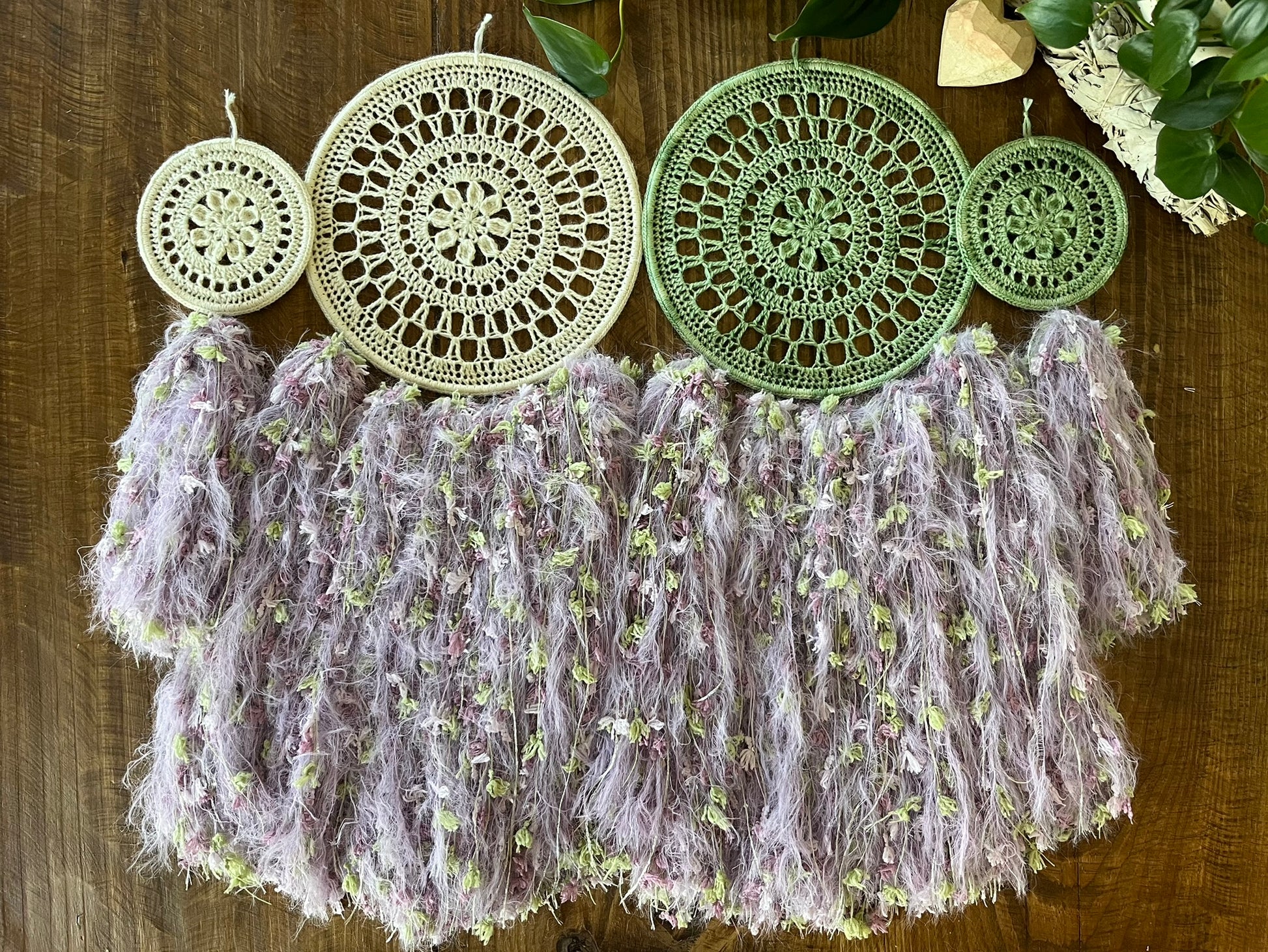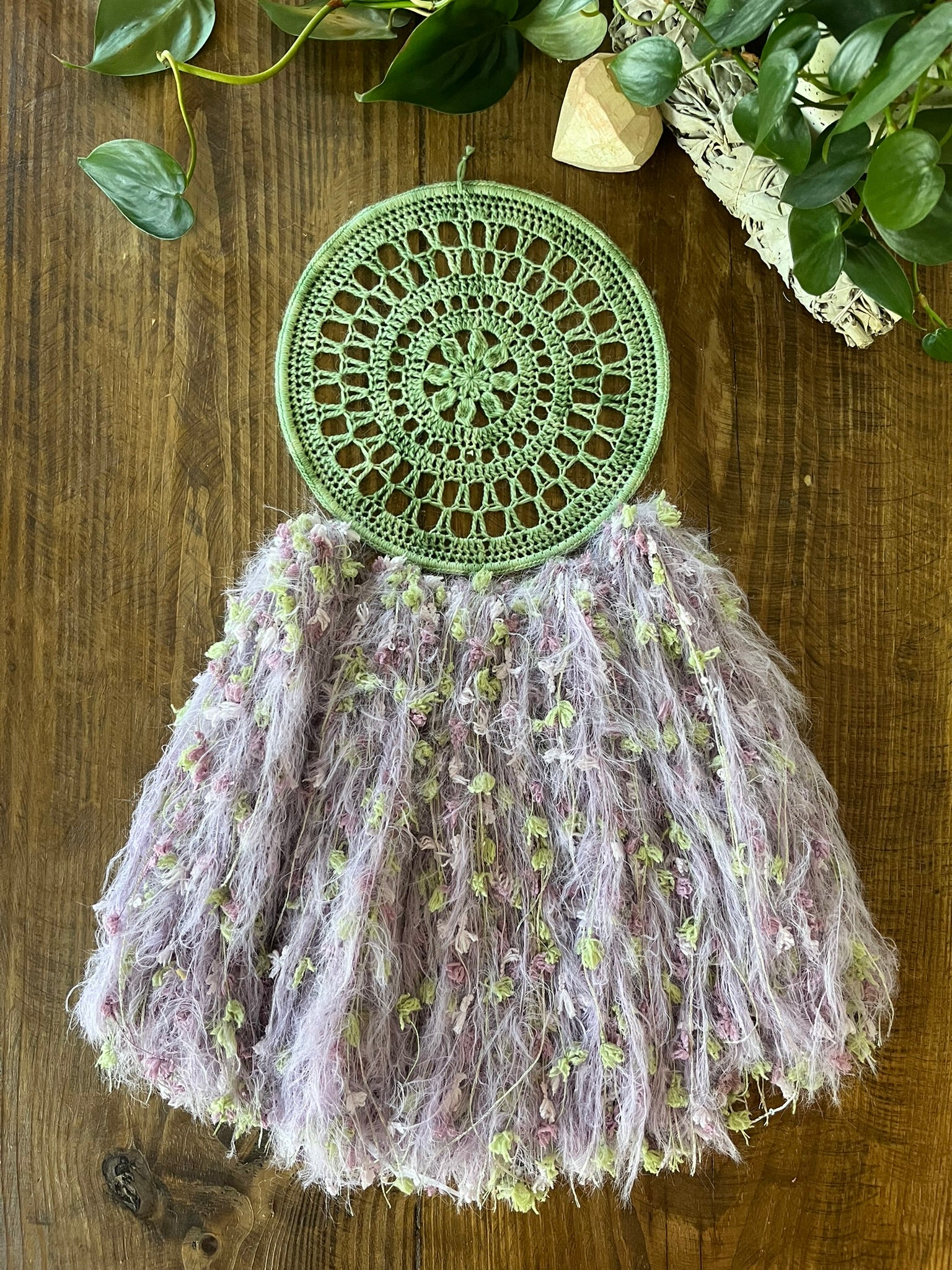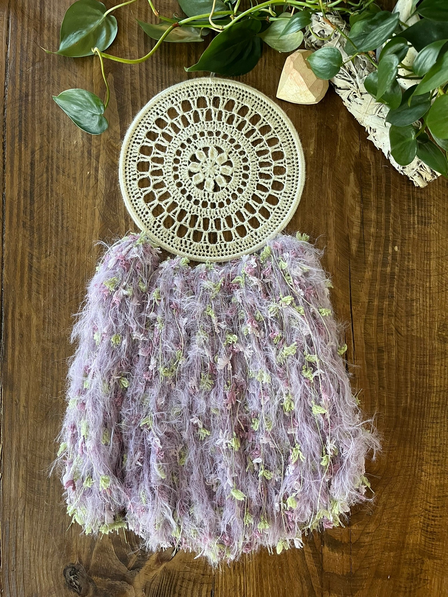 Soft, enchanting, and full of whimsy, Lavender Fluff is a daydream come true. Hand-dyed purples and fluttery textures bring to mind twilight blossoms and lavender fields kissed by stardust. Whether hung in a cozy corner or a meditation space, this dreamcatcher radiates gentle, calming energy.