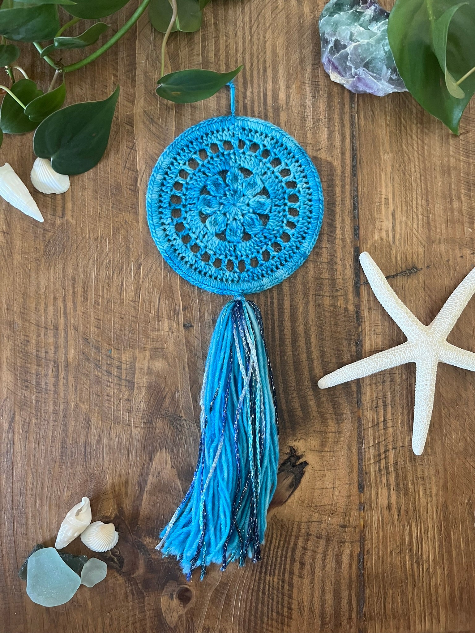 Dive into a world of ocean hues and shimmering magic with these hand-crocheted dreamcatchers. Inspired by the sea, each piece blends hand-dyed alpaca yarn in blues, aquas, purples, and iridescent accents to capture the enchanting beauty of waves, tides, and coastal treasures.