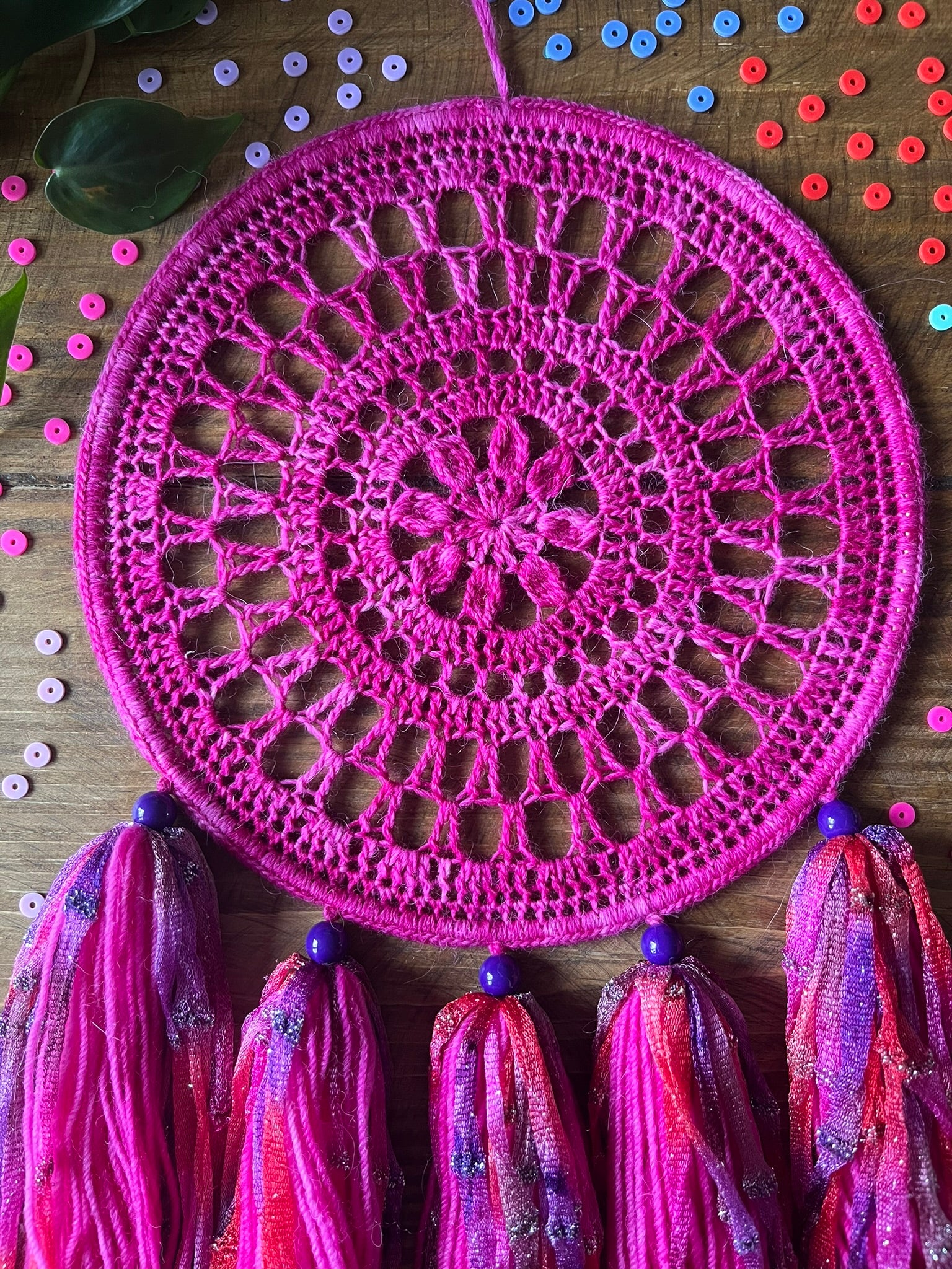 Light up your space with bold, electric color. The Neon Dreamers are hand-crocheted dreamcatchers crafted with vibrant, hand-dyed alpaca yarns in striking neon hues. These playful, high-energy designs bring brightness and joy to any room, perfect for dreamers who love their décor with a bold twist.